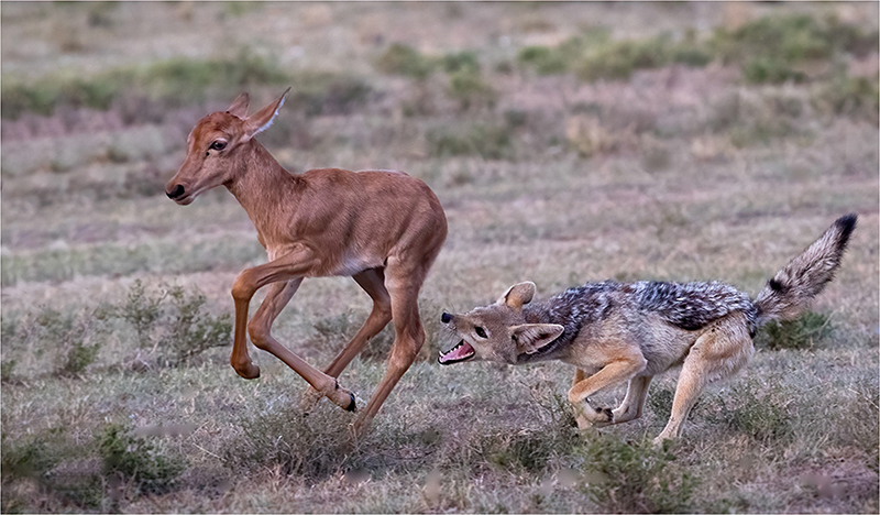 Jackal chasing Topi Calf by Diana Knight